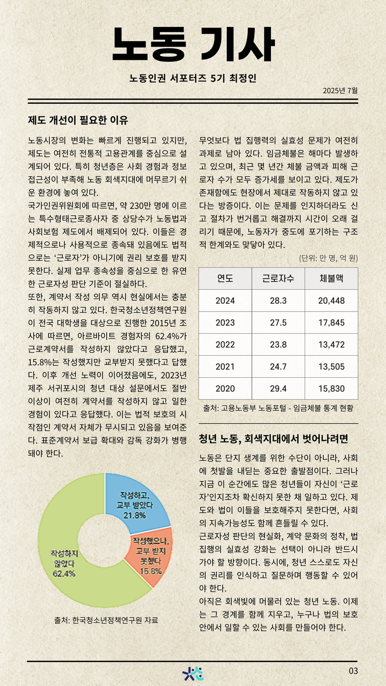 청년도 자신의 권리를 알고, 계약 문화와 법 제도가 제대로 작동해야 합니다.